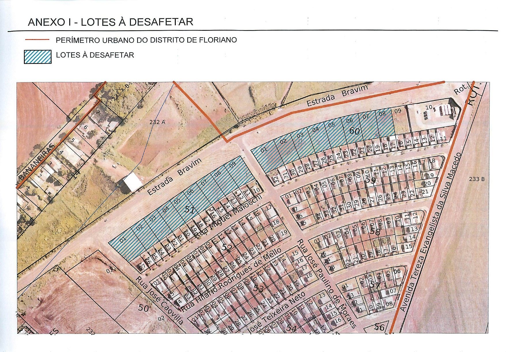 Ficam desafetadas as áreas públicas do Distrito de Floriano, para fins de regularização de alteração da destinação dada aos lotes a seguir relacionados: