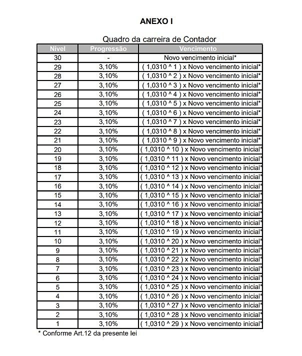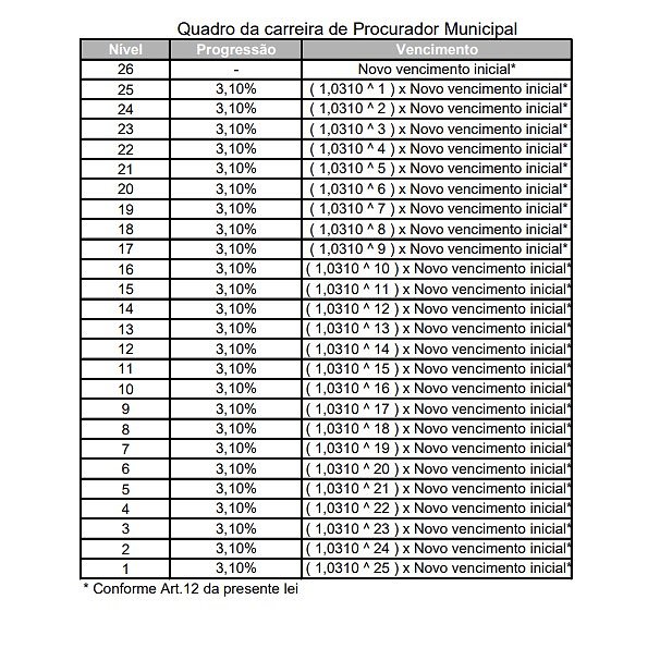 Alimentos, Engenheiro Eletricista, Engenheiro Florestal, Engenheiro Químico, Engenheiro Sanitarista, Contador e Procurador Municipal, e que servirá de base para as categorias seguintes, consistente