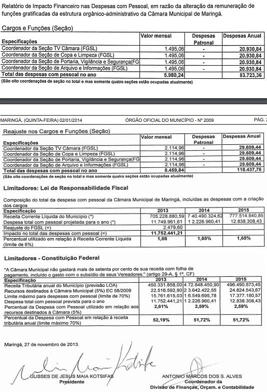 Na qualidade de ordenador de despesas, declaro, em cumprimento ao disposto no artigo 16, inciso II, da Lei Complementar n. 101/2000, que a alteração da remuneração da função gratificada classificada como FGSL, prevista no Anexo III da Lei n. 8.875/2011, que dispõe sobre a organização política e a estrutura orgânico-administrativa deste Poder Legislativo, objeto do presente projeto de lei, tem adequação orçamentária e financeira com a previsão orçamentária anual e é compatível com a Lei de Diretrizes Orçamentárias e com o Plano Plurianual de Ação.